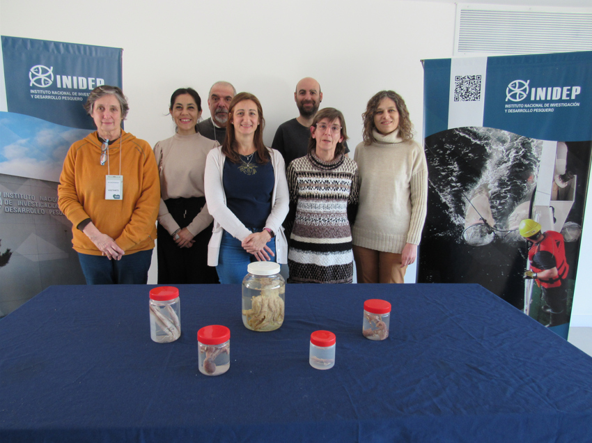 El director del INIDEP, Mg. Gonzalo Bacigalupo; la directora de Pesquerías de Invertebrados y Ambiente Marino, Dra. Inés Militelli, la jefa del Programa Pesquerías de Cefalópodos, Dra. Marcela Ivanovic, los investigadores Lic. Mercedes Berrueta, y Lic. Nicolás Prandoni, y la responsable de Muestras Permanentes, Silvia Rivero, recibieron a la coordinadora de la Unidad Funcional Digitalización del Museo de La Plata, Dra. Cristina Damboerena y al investigador Dr. Gustavo Darrigan, para hacerles entrega de las muestras de los ejemplares de las especies.